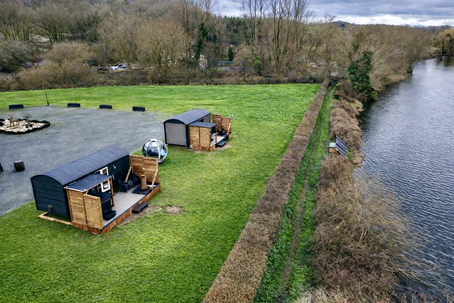 Choose between two stunning huts, each offering a unique interior, both have private decking, hot tub, and outdoor fire. Sharing the garden pod between the two huts.